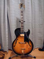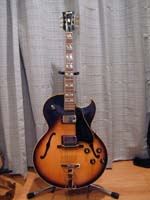 | GibsonのES175です。60年代初期のモデルで、1990年に大阪の楽器店でオールド品を購入しました。ブリッジのみ交換しています。オールドらしく枯れた音の楽器です。 | これはGibsonのES165 Herb Ellisモデルです。1996年に奈良のJazz喫茶のマスターで元プロギタリストの人が購入し調整済みのものを譲ってもらいました。甘く太い音色の楽器ですが、フルアコを弾くにはJC-120は不向きです。このギターはバンドのメンバーに譲りました。 |