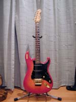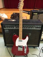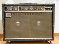 | Fender Japanのストラトキャスター(1988年入手)。シリアルNo.はE843180、1984〜87年のフジゲン製、STR-75というモデルだと思います。ピックアップはリアのみハンバッキングで、フュージョン系のバッキングからソロまでかなり使えます。フロイドローズのトレモロ付きで、スクエアの曲を弾くときは重宝しました。 | ローランドのギターアンプJC-120。かれこれ20年位愛用しているものです(1985年入手)。クリアでくせのない音で、ストラトのハーフトーンにコーラスをかけてアルペジオを弾くと広がりのある絶妙な音がします。 |